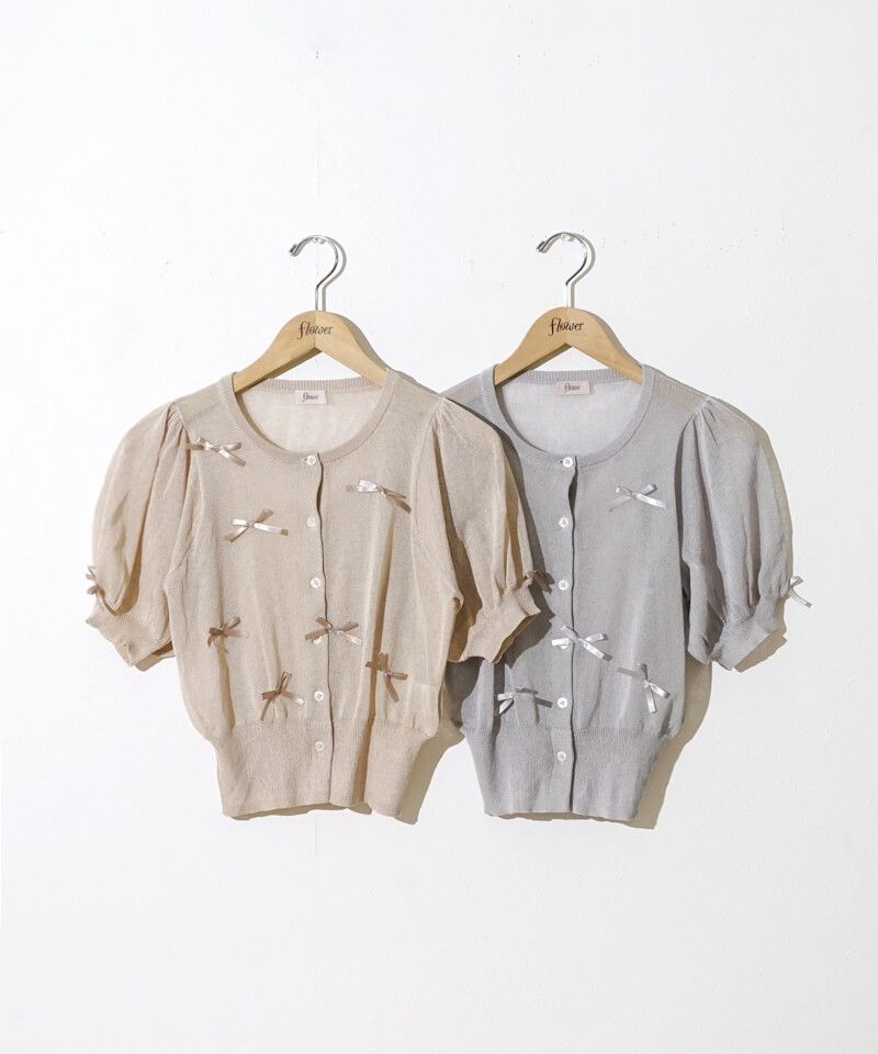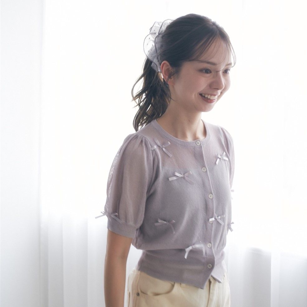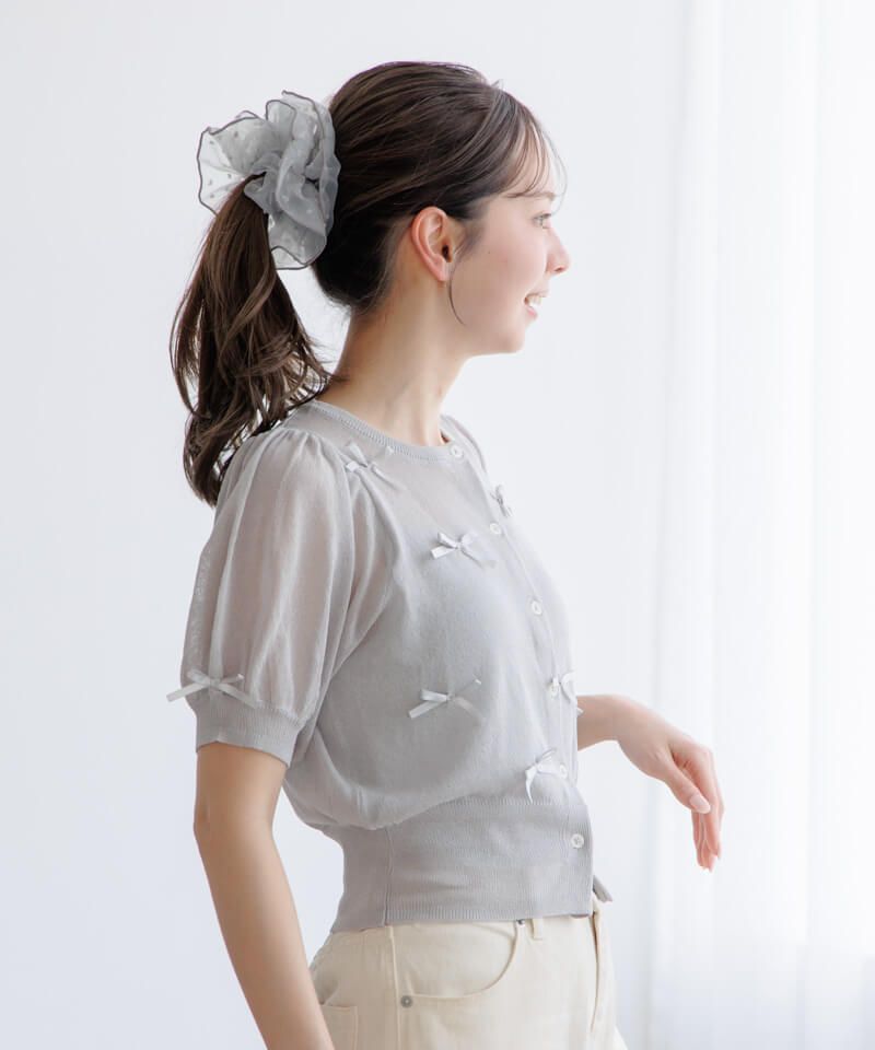 小さなリボンが付いた透明感たっぷりなシアー素材の半袖カーディガン♪