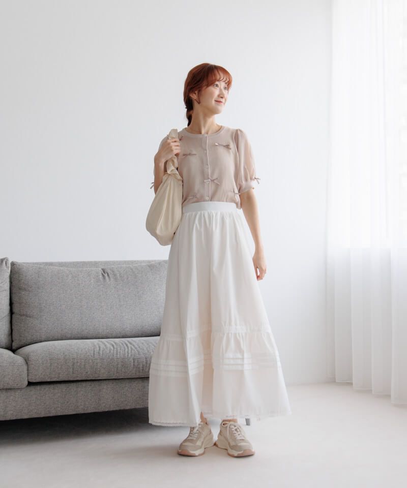 ナチュラルな素材感と甘めのデザインの組み合わせが